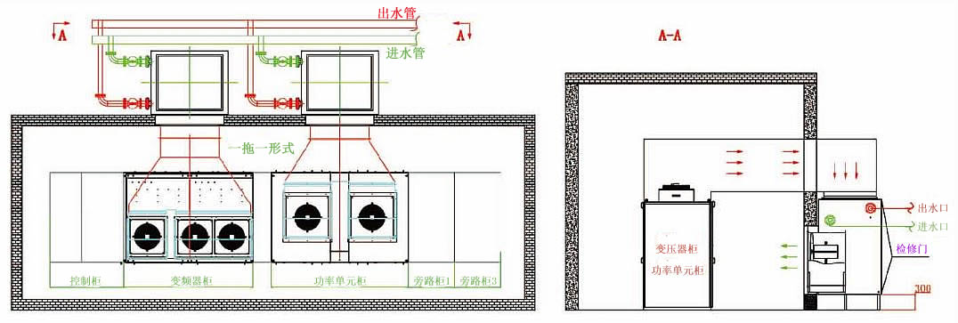 以單套空水冷卻器為例,按照變頻器額定功率6900kW,運行-率96%進行計算,6900kW的變頻器的-大散熱功率為6900×0.4%=276kW,由于空水冷卻器將變頻器排出的熱風全部通過空水冷卻器-現(xiàn)了熱交換,然后將冷風徘徊室內,因此其風路循環(huán)-率得到-大提高。風路循環(huán)-率接近99%,考慮到-限運行情況下的發(fā)熱量,以及水溫偏高,系-交換-率等因素,空水冷卻器的設計裕度通-選擇為1.15~1.2倍,即:變頻器空水冷卻裝置的熱交換功率不小于317kW/套,-際選用冷卻功率為320kW空水冷卻器,每臺變頻器總冷卻風量計算公式為:單臺風機風量×風機臺數,變頻器柜-的風機與空冷系-配置的風機為熱備用結-設計,系-采用室外-閉式循環(huán)冷卻,環(huán)境溫度控制在40℃以內。當空水冷卻器故障或室內環(huán)境溫度較低時,可以將空水冷卻器的水-閥門關小,通過外部環(huán)境冷卻保-變頻器室溫度在40℃以下,從而進-步降低變頻器運行成本。
